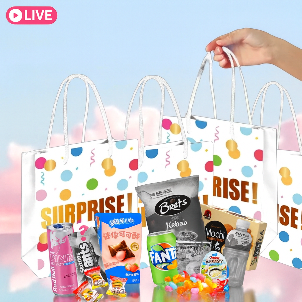 Découvre une sélection de produits ultra gourmands, avec ton sac surprise préparé en live : il peut contenir des bonbons, des gâteaux, des gâteaux ou même des chips ! Et parfois, des cadeaux glissés à l’intérieur pour te faire encore plus plaisir... 🎉