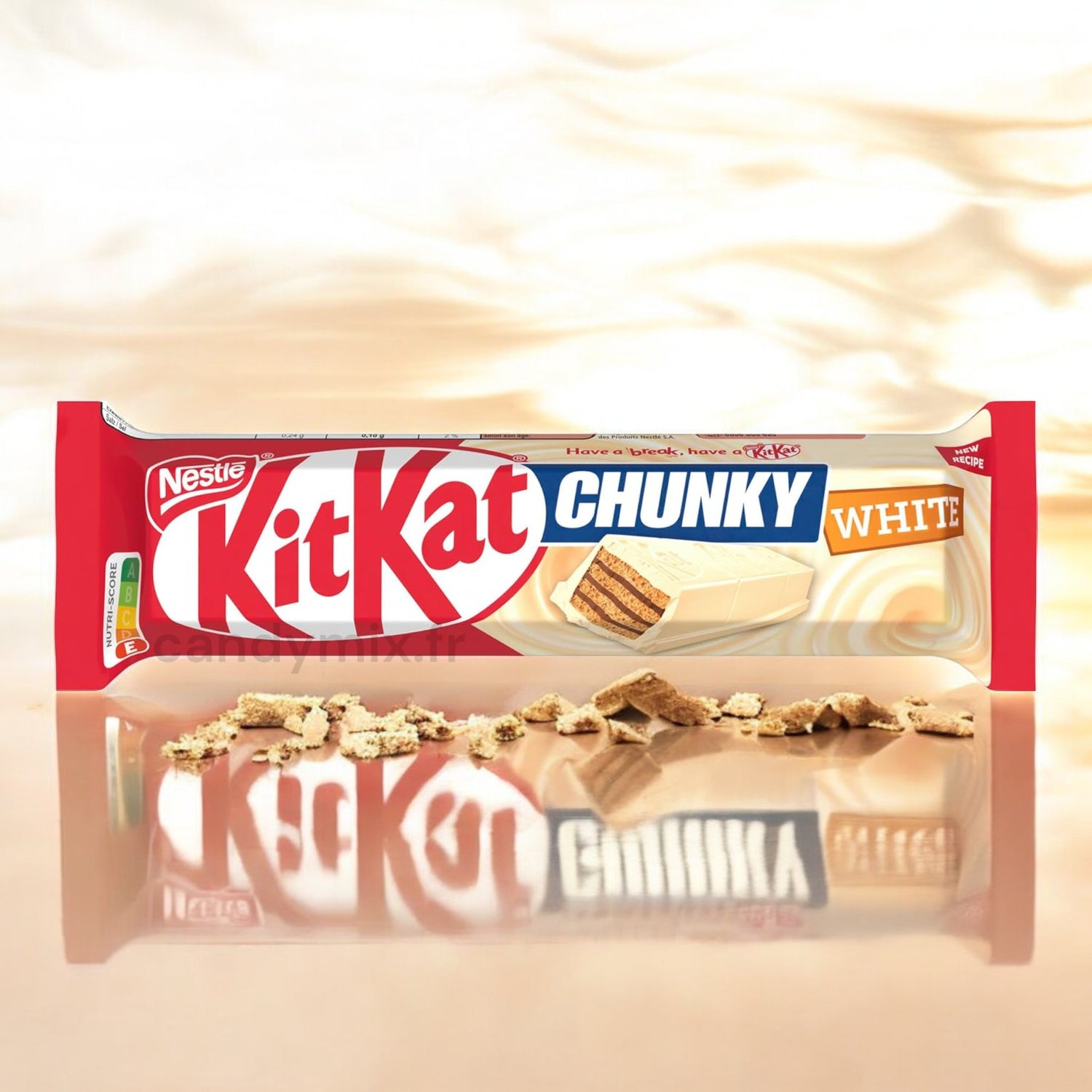 Découvre notre nouveau KitKat dans un format ultra gourmand ! Tu vas fondre pour ce KitKat Chunky White Chocolate ! Avec leur barre de chocolat croustillante recouverte de chocolat blanc, chaque croc est un vrai délice pour tes papilles ✨🍫
