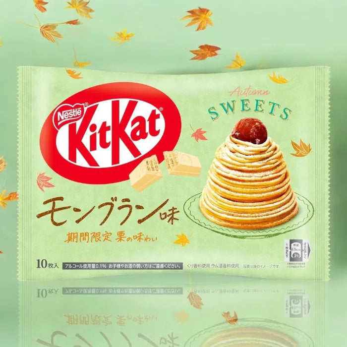 KitKat Mini Mont Blanc est une Ă©dition spĂ©ciale inspirĂ©e du cĂ©lĂšbre dessert français, le Mont Blanc. Ce KitKat japonais revisite le classique biscuit gaufrette avec une touche de crĂšme de marron douce et onctueuse, le tout enrobĂ© dâun dĂ©licieux chocolat blanc. Parfait pour une pause sucrĂ©e raffinĂ©e, ce mini KitKat est une vĂ©ritable expĂ©rience gourmande Ă savourer et Ă partager.