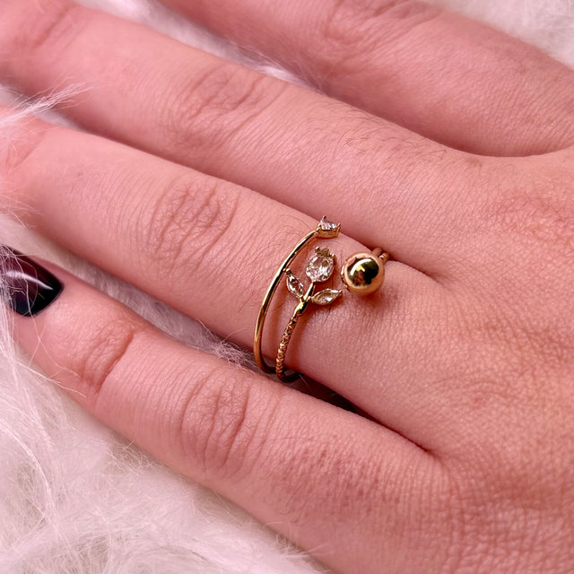 Craque pour l'élégance de la bague en acier inoxydable Louise. Une des extrémités est agrémentée d’une petite sphère lisse et polie, tandis que l’autre se termine par deux cristaux délicats en forme de feuilles. L’anneau, subtilement texturé avec de légers motifs ciselés, crée un contraste harmonieux avec les éléments lisses et scintillants. Les cristaux capturent la lumière, ajoutant une touche d’élégance lumineuse à l’ensemble.