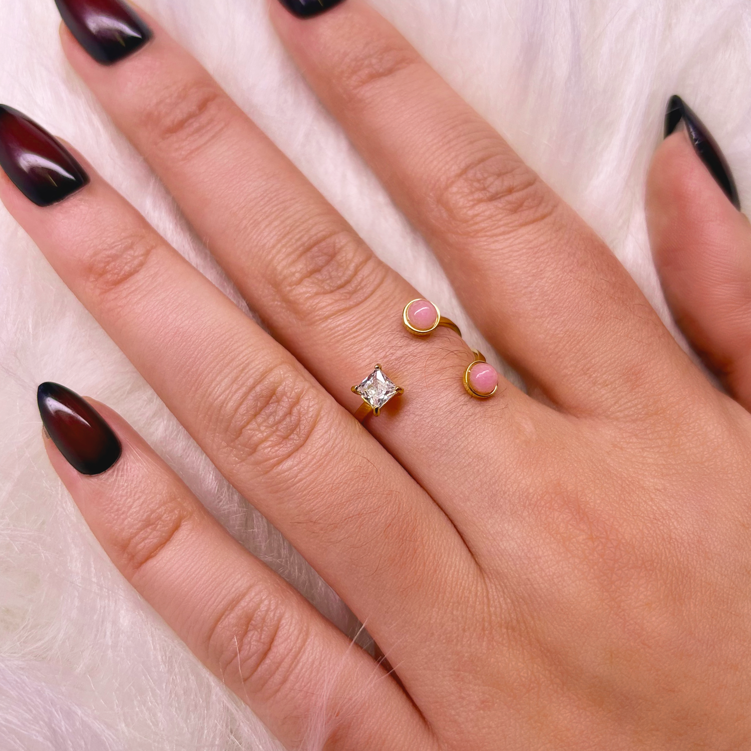 Bague dorée en acier inoxydable, ornée de pierres rose et d'oxydes de zirconium.