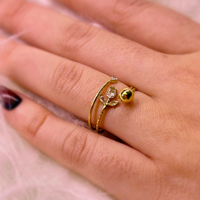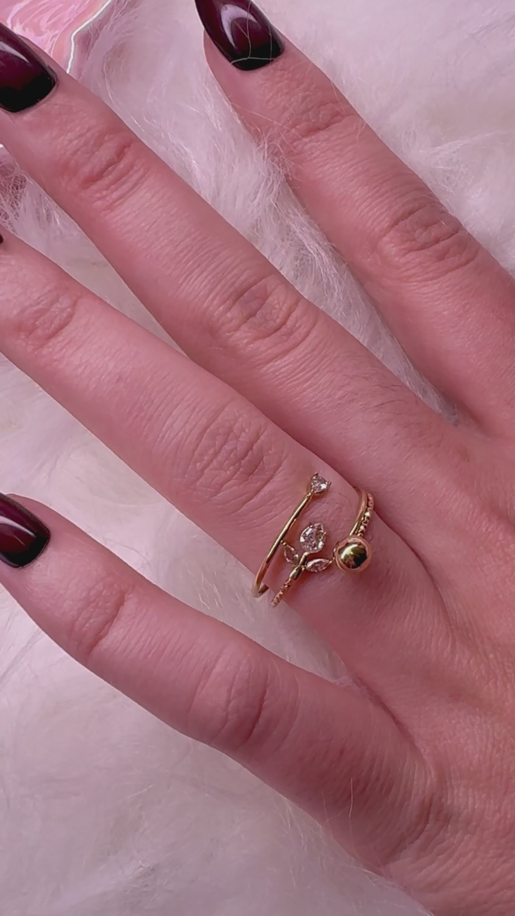 Craque pour l'élégance de la bague en acier inoxydable Louise. Une des extrémités est agrémentée d’une petite sphère lisse et polie, tandis que l’autre se termine par deux cristaux délicats en forme de feuilles. L’anneau, subtilement texturé avec de légers motifs ciselés, crée un contraste harmonieux avec les éléments lisses et scintillants. Les cristaux capturent la lumière, ajoutant une touche d’élégance lumineuse à l’ensemble.