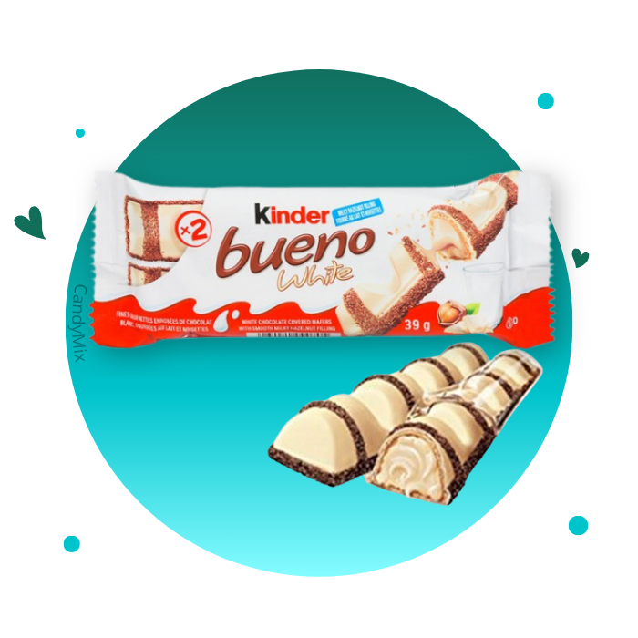 Die Schokoladenbar Kinder Bueno White war in der Lage, die Herzen von Liebhabern von Süßigkeiten auf der ganzen Welt zu gewinnen. Sein Herz aus Licht Wafon, eingewickelt Feine weiße Schokolade und Haselnüsse, versteckt ein cremiges und cremiges Interieur aus Haselnuss. Jeder Bissen dieser Kinder bietet eine Symphonie von Texturen und Aromen. Die perfekte Harmonie zwischen knusprig und fondant gemacht aus Kinder Bueno White Die ideale Wahl für eine Gourmetpause.