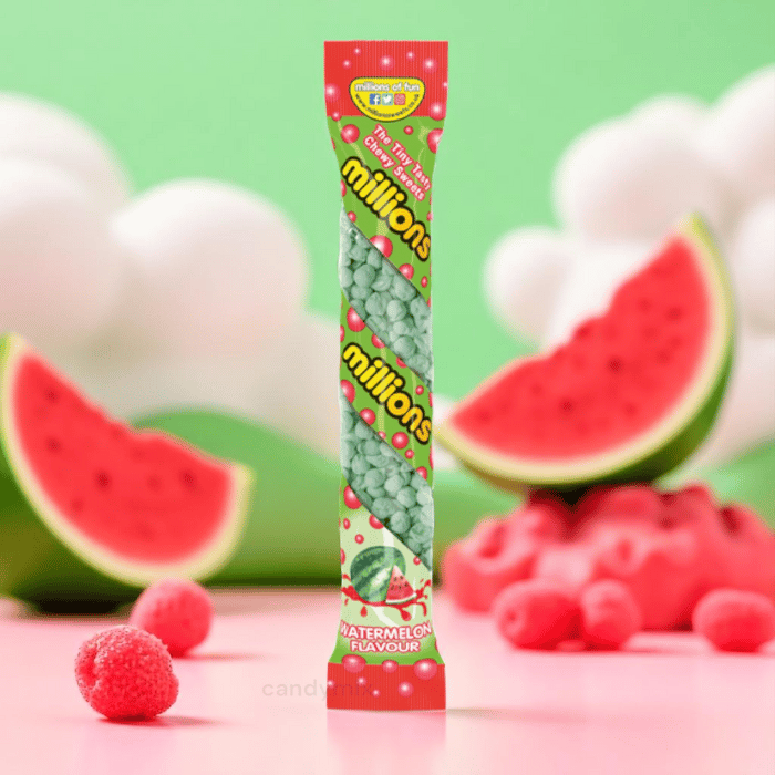 Sich auf die köstlichen kleinen Bälle verlieben Millionen Zum guten Geschmack von Wassermelone! Eine Röhre voller mini -ultra -fruchtiger Süßigkeiten, sowohl knusprig als auch zäh, perfekt für eine süße Pause voller Frische.