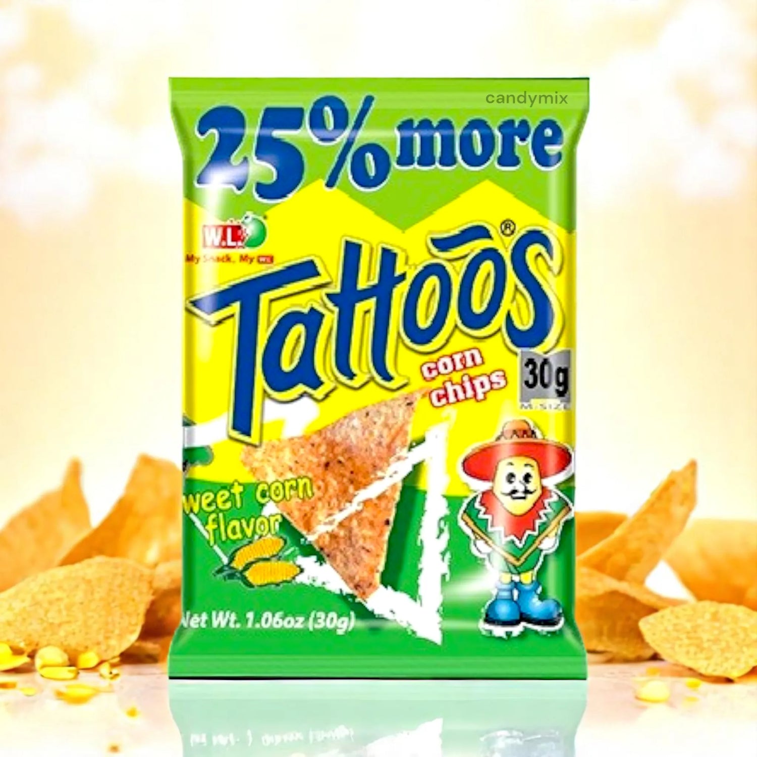 DER Tattoos Mais -Chips ZuckermaisgeschmackSie sind knusprige Maischips mit einem guten Geschmack von Zuckermais! Dies ist der perfekte Snack für Kinder und Fans von Junk Food lustig.