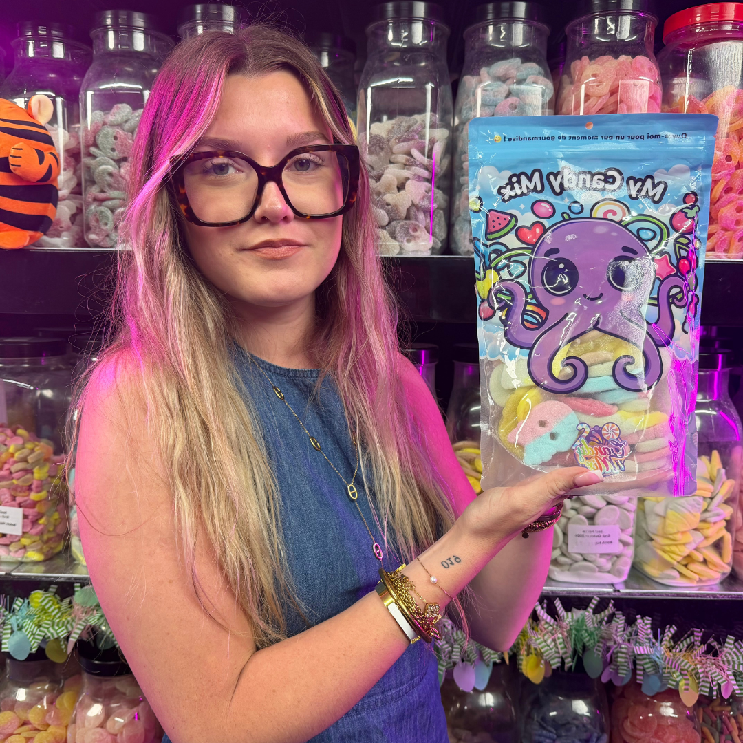 Para limitar el plástico, los caramelos a granel se agrupan en una bolsa por tipo de caramelo/chocolate (ácido, suave, halal, vegetal, chocolate).