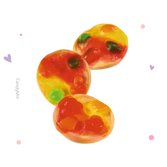 Estos dulces se destacan por su forma divertida de mini pizzas 🍕 y su delicioso sabor. Su apariencia divertida y su sabor afrutado Haz que sea la elección ideal para agregar un toque de fantasía a tus dulces descansos. 🎉 Cada bolsita es una promesa de placer y dulzura para saborear. 😍🍬