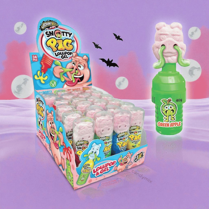 Tu cherches un bonbon qui sort vraiment de l’ordinaire ? Avec le Snotty Pig de Johny Bee, prépare-toi à une expérience aussi drôle que gourmande ! Ce petit cochon en plastique cache un bonbon liquide acidulé… qui coule par ses narines 🤭. Tu appuies doucement et hop : le bonbon “morveux” sort pour que tu puisses le déguster directement. C’est sucré, piquant, et surtout complètement délirant. Les enfants (et les plus grands) adorent son côté fun et dégoûtant à la fois.