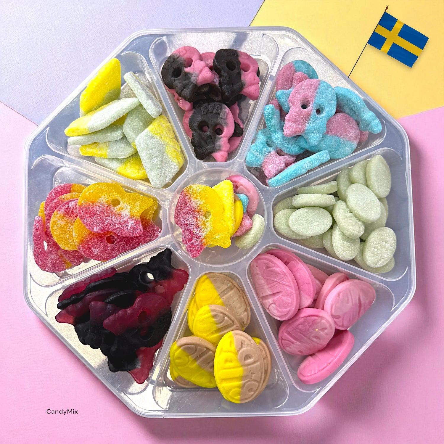 Découvre le plateau de bonbons Bubs le plus stylé du moment, rempli de 900g de bonbons suédois ultra tendances, ceux qu’on voit partout sur TikTok ! Crânes acides, réglisse framboise, poire, banane, grenade, bubblegum… Un mix iconique qui fait vibrer les fans de bonbons du monde entier.