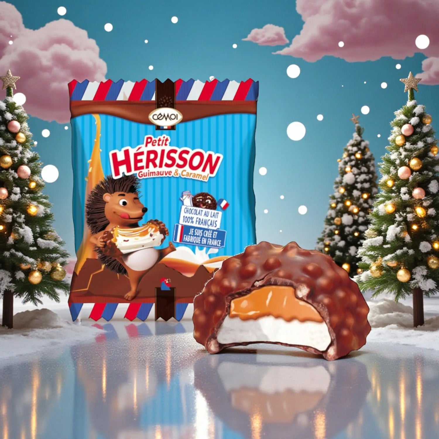 Le Petit Hérisson Guimauve & Caramel est une délicieuse bouchée enrobée de chocolat, cachant en son cœur une guimauve de Noël ultra tendre et un filet de caramel fondant.