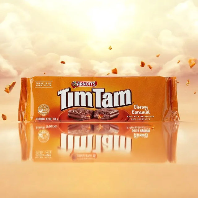 EL Tim Tam Caramel D'Arnott's, estas son deliciosas galletas australianas con un corazón derretido de caramelo, cubierto con una cobertura de chocolate con leche. Un clásico de codicia directamente de Australia, perfecto para los amantes de los dulces reconfortantes. Estas galletas combinan el crujiente, el fondant y la suavidad para un descanso del 100 %.
