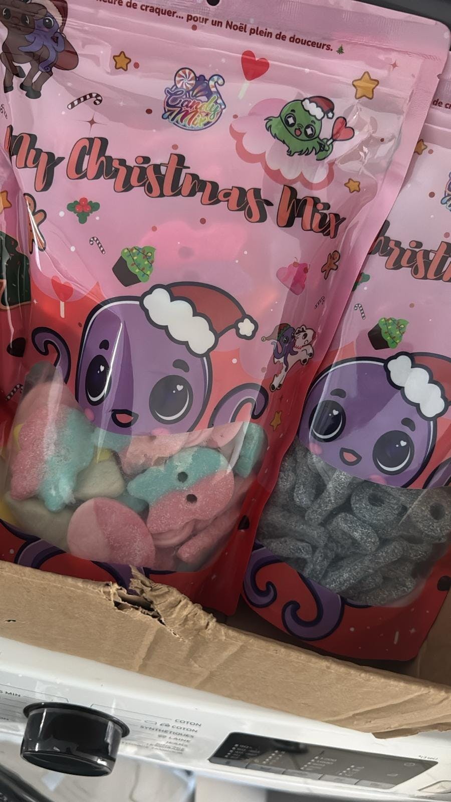 Pour limiter le plastique, les bonbons en vrac sont rassemblés dans un sachet par type de bonbons/chocolats (Acides, lisses, Halal, Veggie, Chocolat).